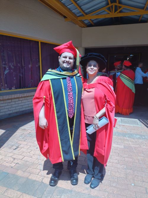 Dr Douw Faurie graduated with his Doctoral Degree at FEBE’s Spring graduation in October 2025. With him is his research supervisor, Dr Kasturie Premlall.