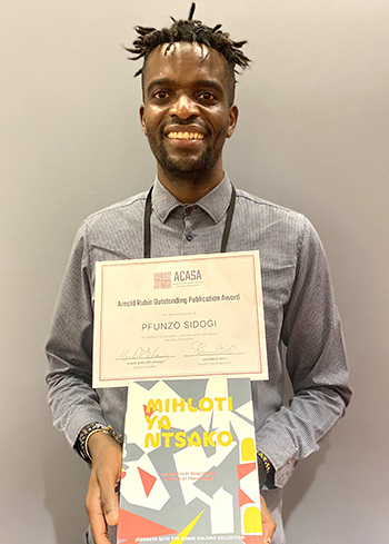 PROUD MOMENT! Prof Pfunzo Sidogi, Head of the Department of Fine and Studio Arts, with the prestigious Arnold Rubin Outstanding Publication Award that he received in Chicago for his book Mihloti Ya Ntsako: Journeys with the Bongi Dhlomo Collection.