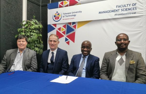 Prof Johan de Jager, Dr Anthony Drotsky, Dr Edgar Nesamvuni and Prof Ndivhuwo Tshipala who represented TUT during the virtual signing ceremony.