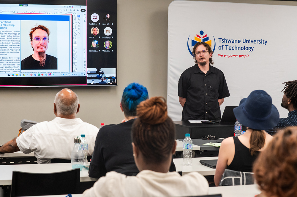 The day also included five poster presentations by Prof Karendra Devroop (The impact of music in the mental health of high school and university students in South Africa), Rorisang Sechele (Establishing a sustainable career as a female Jazz Vocalist): A case study of three South African Jazz Vocalists), Dr Roland Moses (Adapting Thematic Musical Elements for Instructional Design: Building a Conceptual Framework for Online Jazz Piano Education at a University of Technology), Lanie van der Walt (A comparative analysis of artificial intelligence-powered audio mastering versus human audio mastering) and Teboho Kobedi (An Exploration of African Musical Elements in the Compositional Style of Themba Mkhize).