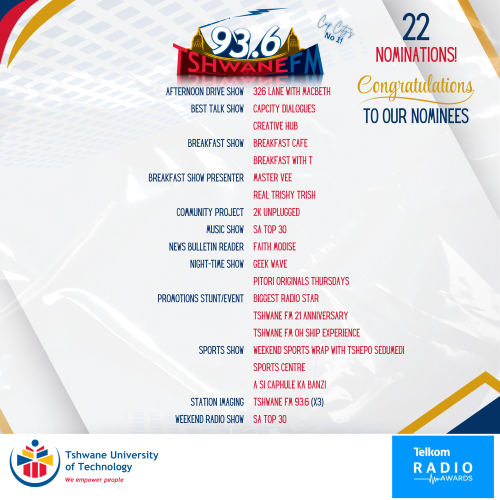 Tebogo Jacko Magubane, Station Manager, described the moment as a defining one for the station. “This is a proud moment for Tshwane FM and for the entire TUT community. Our 21st anniversary reminded us of who we are and why we exist. These nominations show that our work is being heard and valued. The station has grown, the team has grown and our voice has never been stronger.”